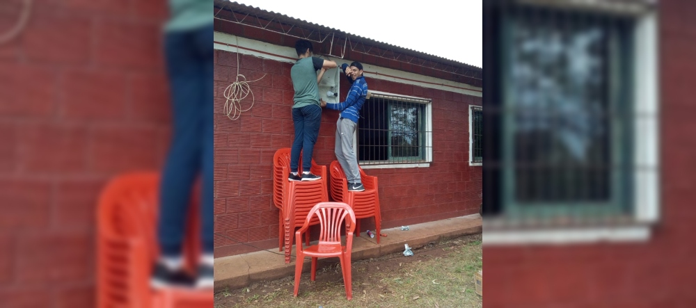 En dos días – jueves y viernes – los chicos realizaron la instalación eléctrica compleja “desde la línea principal al tablero y desde ahí hacia adentro”. Colocaron cinco toma corriente en el salón y fabricaron nuevos reflectores que colocaron tanto adentro como afuera, lugar donde se pusieron cuatro con célula fotovoltaica, “un sistema que prende y apaga solo”, explicó Vallejos.