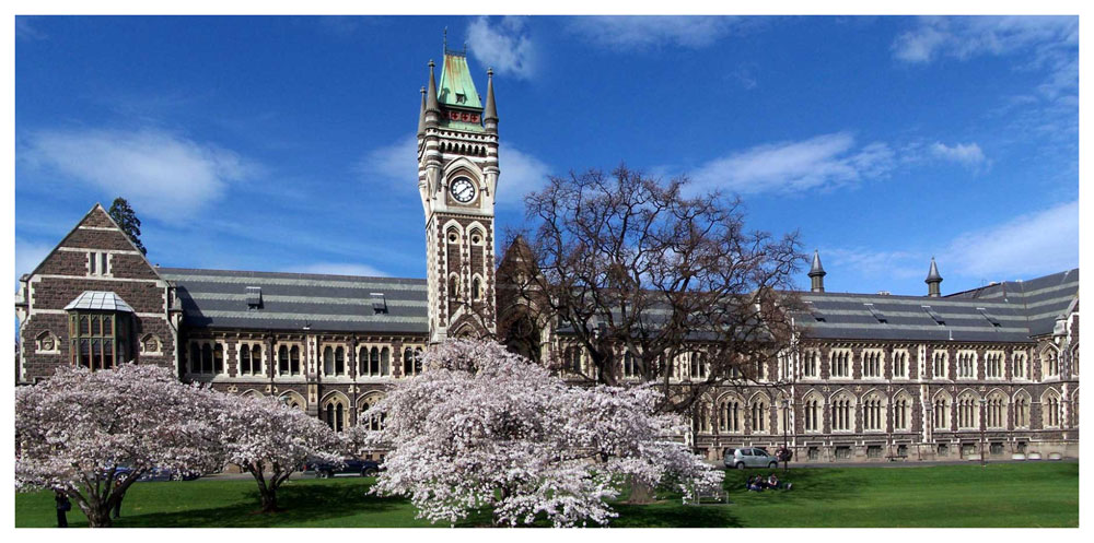 También ubicada en el centro de la ciudad, la Universidad de Otago se destaca por su elegante fachada de estilo victoriano. Está construida en una base de basalto oscuro y piedra oamaru clara lo que genera un contraste muy llamativo para los transeúntes. La torre del reloj, que corresponde al edificio de rectoría de la universidad, es un punto de referencia importante en Dunedin especialmente para aquellos interesados en la arquitectura local.