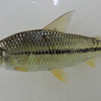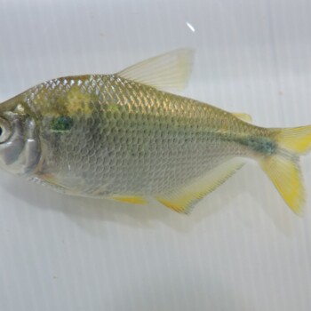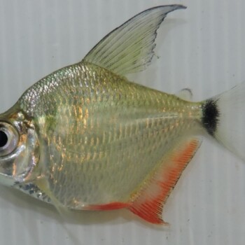 Las aletas son hialinas con tonos amarillentos; las aletas pectorales presentan además una mancha negra en la axila.