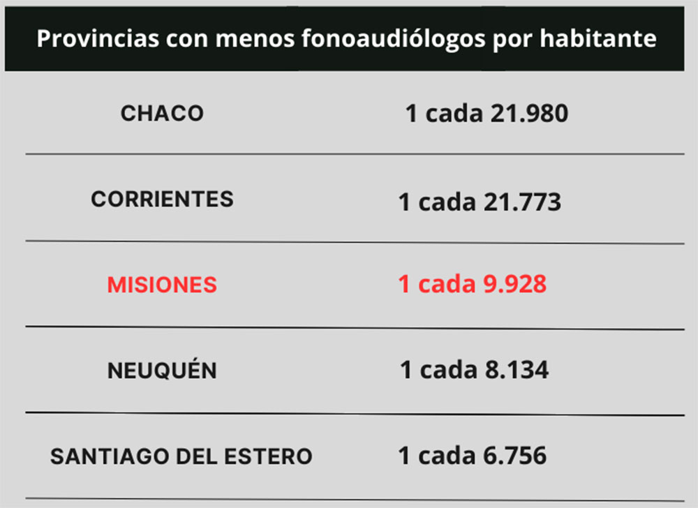 La falta de fonoaudiólogos es una situación generalizada en el país y Misiones no es la excepción, ya que es una de las tres provincias con menos fonoaudiólogos por cantidad de habitantes, según lo reveló un estudio de la Facultad de Ciencias Biomédicas de la Universidad Austral.