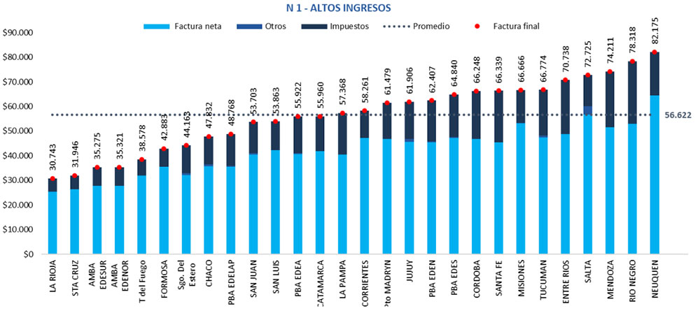 En cambio, aquellos con ingresos altos (N1) aparecen en el tope de las tarifas más caras entre las 23 provincias y CABA.