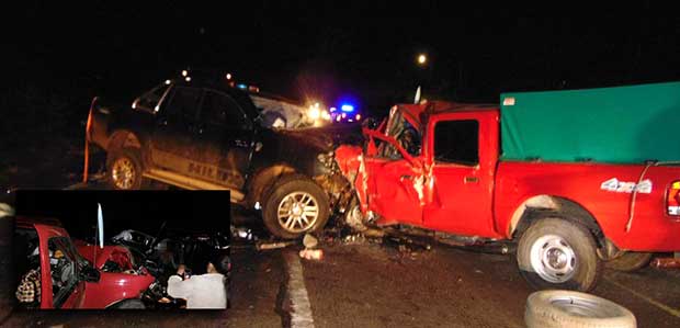 Dos personas fallecidas y un herido grave, quien quedó atrapado entre los hierros, fue el saldo del choque entre una camioneta Ford Ranger roja y una Toyota Hilux negra, anoche en el kilómetro 1.531, de la ruta nacional 12.