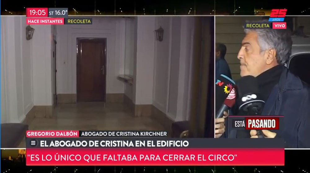En medio del operativo, el abogado de Cristina, Gregorio Dalbón, se acercó corriendo hasta el edificio para constatar que no hayan ingresado ilegalmente a la residencia de senadora, ya que el juez Claudio Bonadio debe esperar la autorización del Congreso.