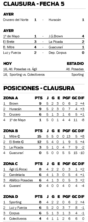 El Brete derrotó por un ajustado 3-2 a La Picada y acompañará en los cuartos de final del Apertura posadeño a Mitre, que se impuso por un claro 4-1 a Guacurarí. Brown goleó a 1º de Mayo y metió presión en la Zona A. En tanto que Luz y Fuerza también ganó y da pelea en la D.