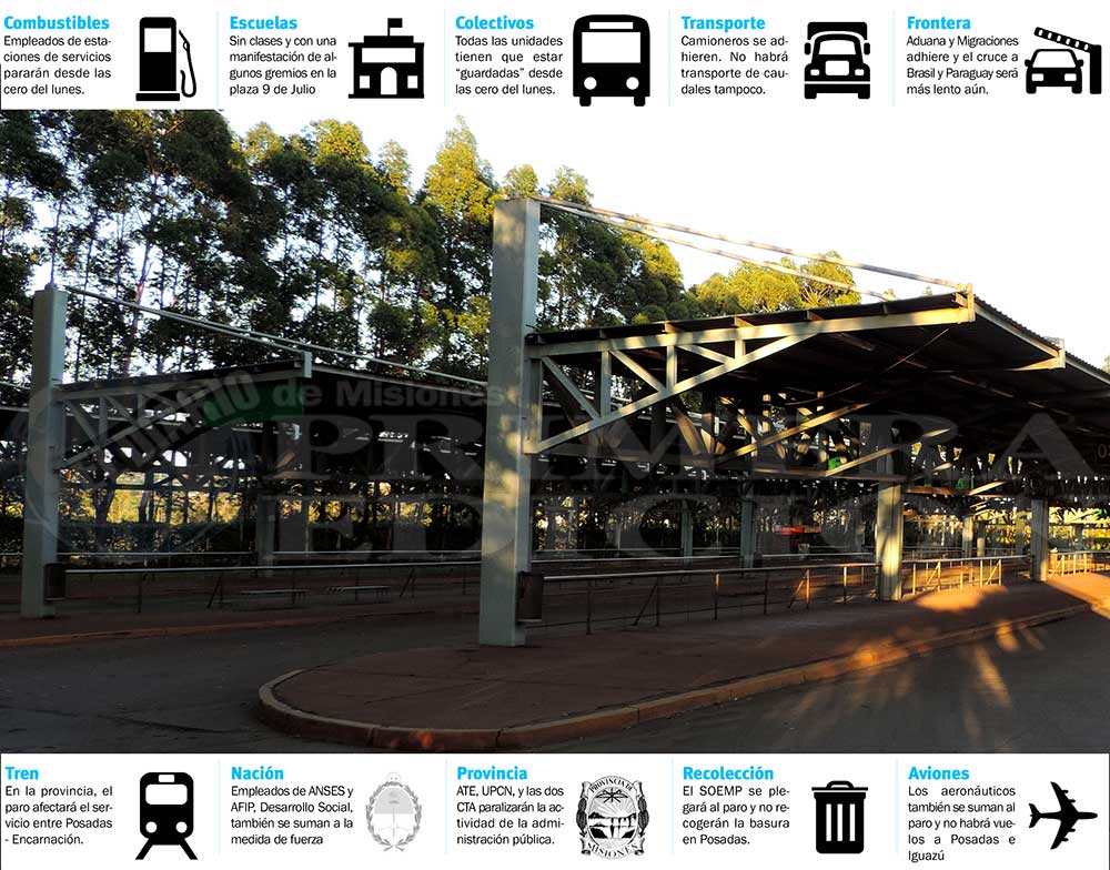 La medida de fuerza nacional convocada por la Confederación General del Trabajo (CGT), en rechazo al modelo económico del Gobierno de Cambiemos, paralizará a toda la “tierra colorada”, en especial porque no habrá servicios de transporte por aire, agua y tierra.