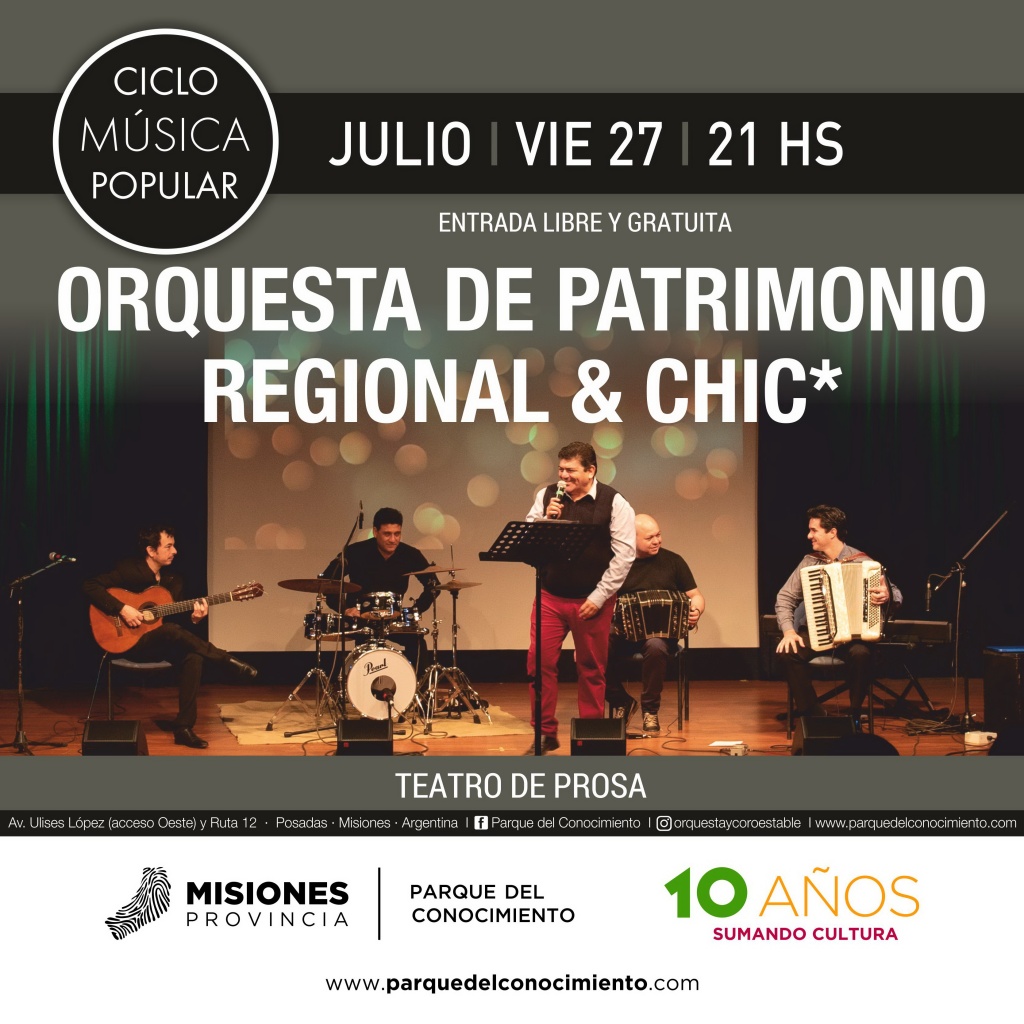 La Orquesta de Patrimonio Regional, integrado por Juan “Pico” Nuñez, Marcos “Chavo” Nuñez, Sergio Tarnoski y Fernando Solís ofrecerán un espectáculo de música misionera y diferentes géneros. Melodías que prometen pintar los paisajes y su gente, desde la Misiones profunda. Esa que nos sorprenderá con sus mitos y leyendas, con aquellos relatos venidos de otras tierras para unirse al canto ancestral de nuestra selva.