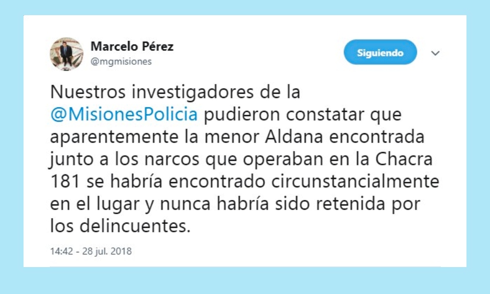 Nuestros investigadores de la @MisionesPolicia pudieron constatar que aparentemente la menor Aldana encontrada junto a los narcos que operaban en la Chacra 181 se habría encontrado circunstancialmente en el lugar y nunca habría sido retenida por los delincuentes.