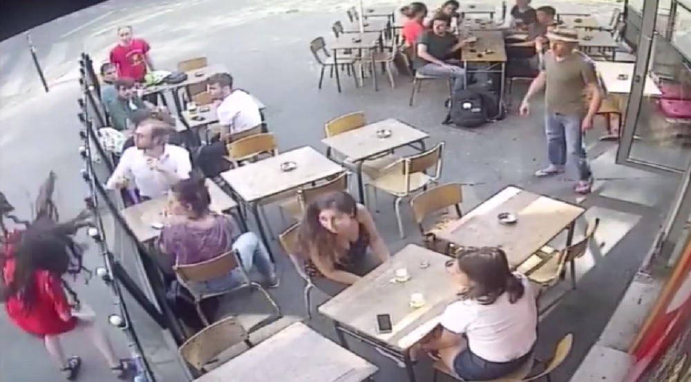 En las imágenes se ve la agresión, seguida de la intervención de varios testigos que estaban en la terraza del café, que intentan hablar con el hombre después del incidente, y que le impiden volver a acercarse a la joven víctima. Finalmente el agresor termina por irse del lugar.