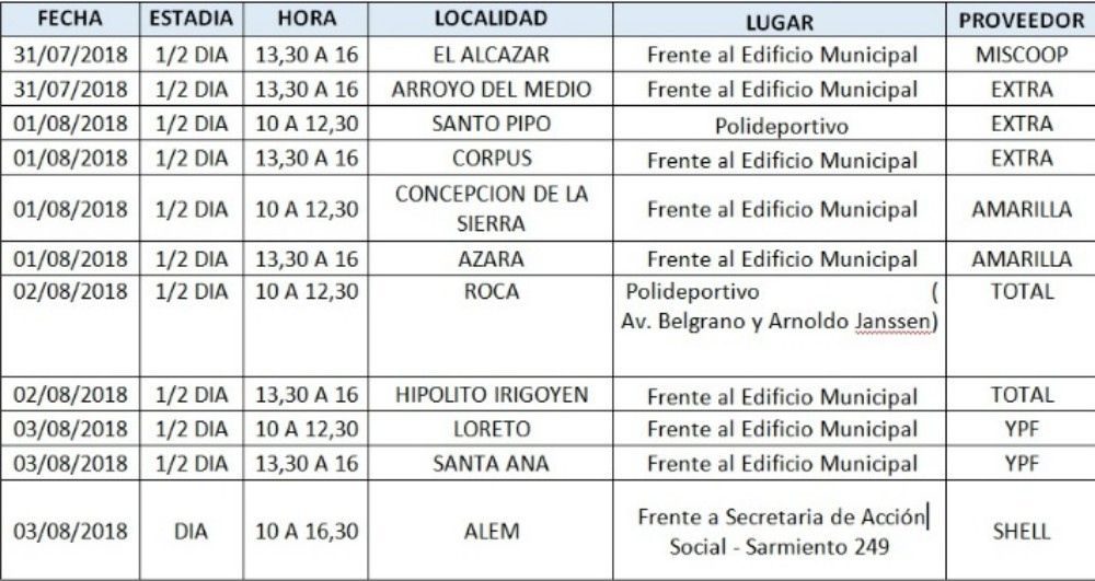 Hoy “Ahora Gas” también estará disponible en El Alcazar y Arroyo del Medio. Mientras que el próximo miércoles 1 llegará a Santo Pipo, Corpus, Concepción de la Sierra y Azara. El jueves 2 será el turno de Gobernador Roca e Hipólito Irigoyen. Y el viernes 3 visitará las localidades de Loreto, Santa Ana y Leandro N. Alem.