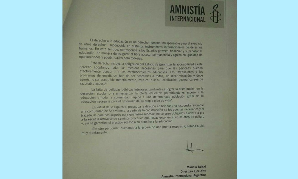 “Según nos informaron, en mayo de este año, la Dirección Provincial de Vialidad, habría concurrido al territorio al que hacemos referencia a los efectos de tomar medidas y construir un puente que permita a los niños y niñas sortear el arroyo. A nuestra organización le interesa conocer qué medidas se previeron para garantizar que todos/as los/as niños/as de los parajes mencionados puedan acceder sin dificultad a la escuela”, expresa la carta que firma la directora ejecutiva de Amnistía Internacional, Mariela Belski.