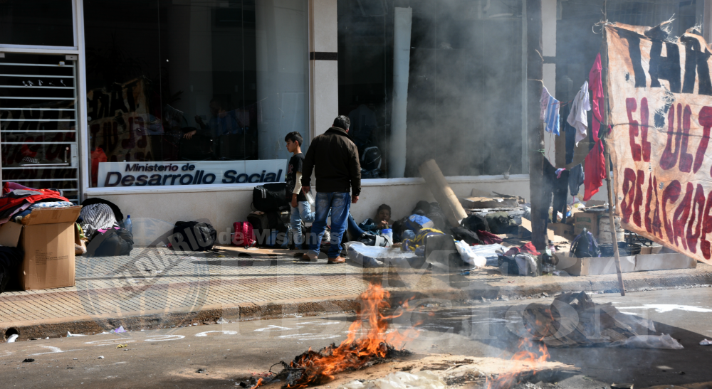 Cientos de trabajadores rurales que integran la Asociación de Tareferos de Oberá continúan manifestándose frente a la sede del Ministerio de Desarrollo Social de la Nación, ubicado sobre la calle Ayacucho y Belgrano de la capital provincial.