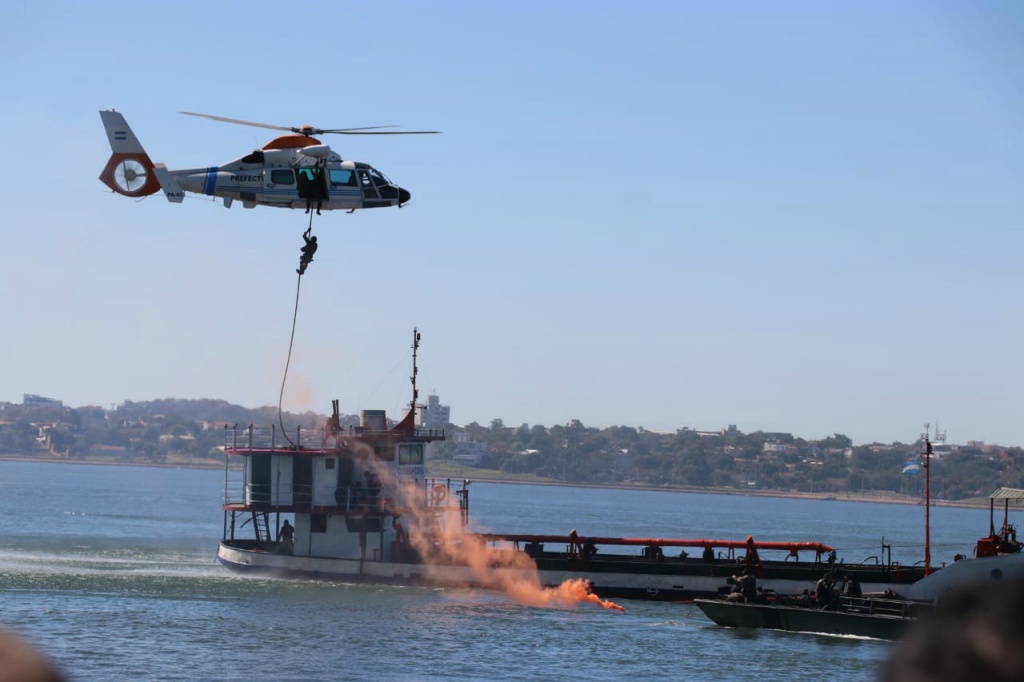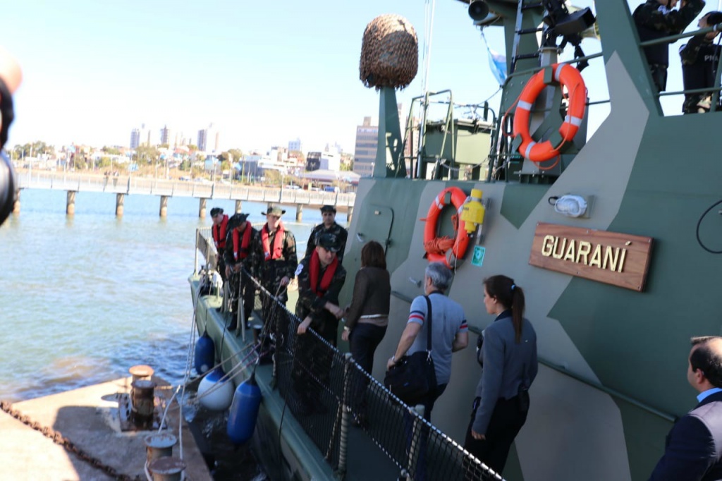 La Ministra presidió además la presentación del los guardacostas “Mataco” y “Guaraní”, quienes protagonizaron un simulacro de operativo anti narco en el medio del Paraná. Mucho público pudo apreciar el espectáculo, realizado con balas de salva y con la participación de helicópteros, anfibios y motos acuáticas.