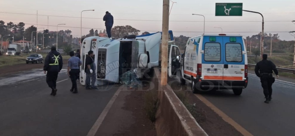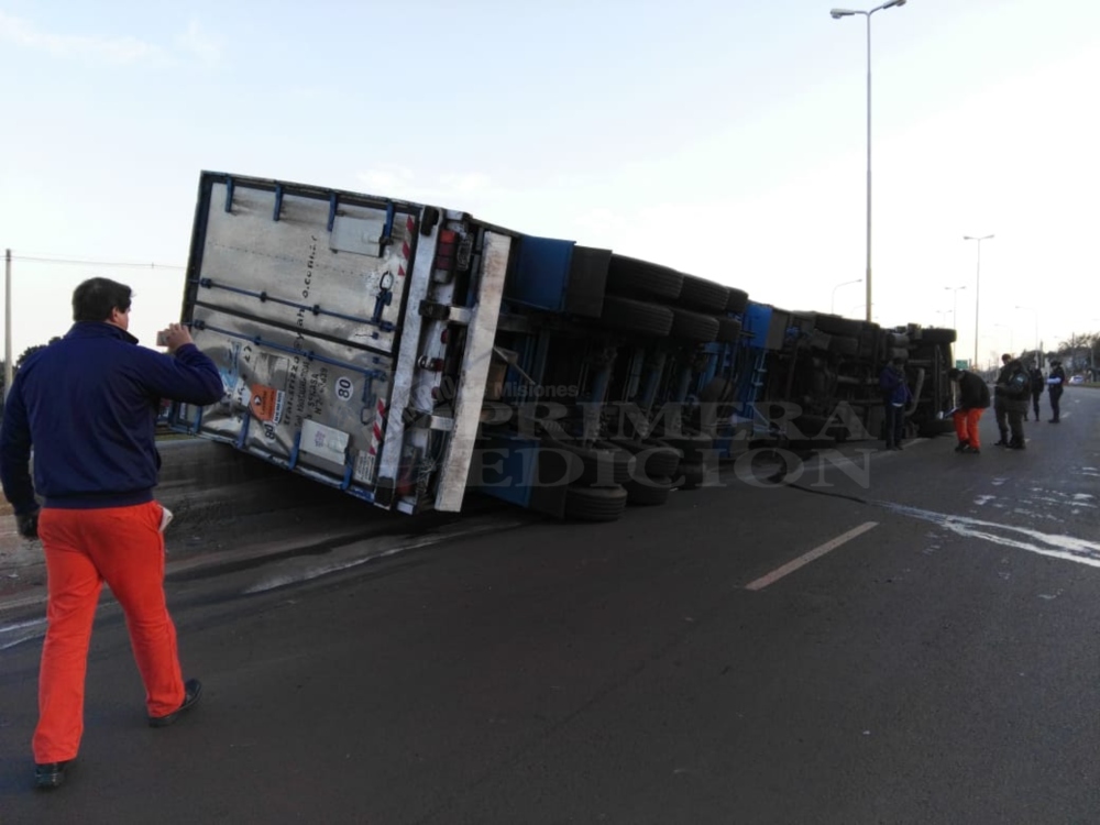 El accidente ocurrió esta mañana. El camión Mercedes Benz, conducido por un entrerriano identificado como Carlos G. de 29 años, circulaba por Ruta 105, sentido San José -Posadas y al llegar a la Rotonda By Pass perdió el control del rodado colisionando contra un guardarraíl. Producto del fuerte impacto despistó y quedó volcado sobre el lateral izquierdo.