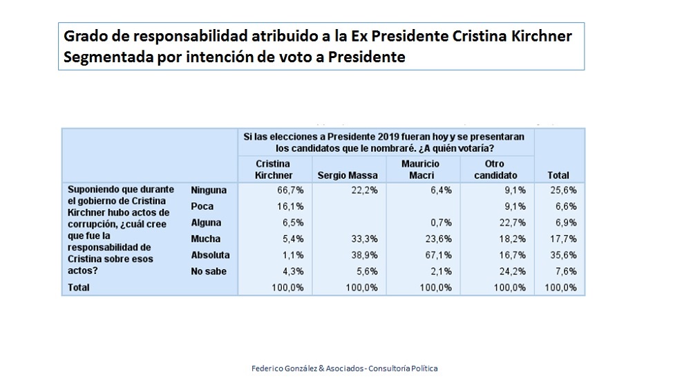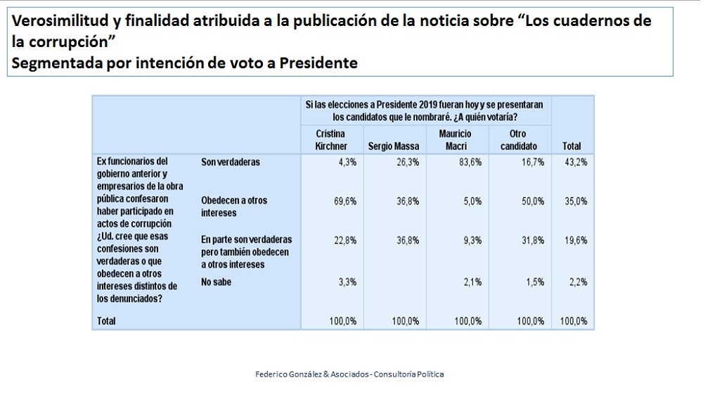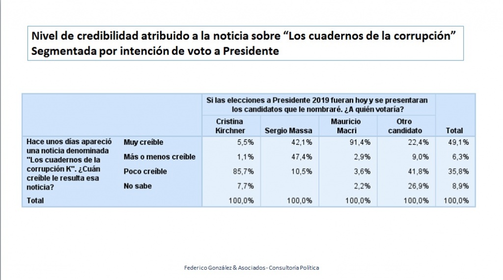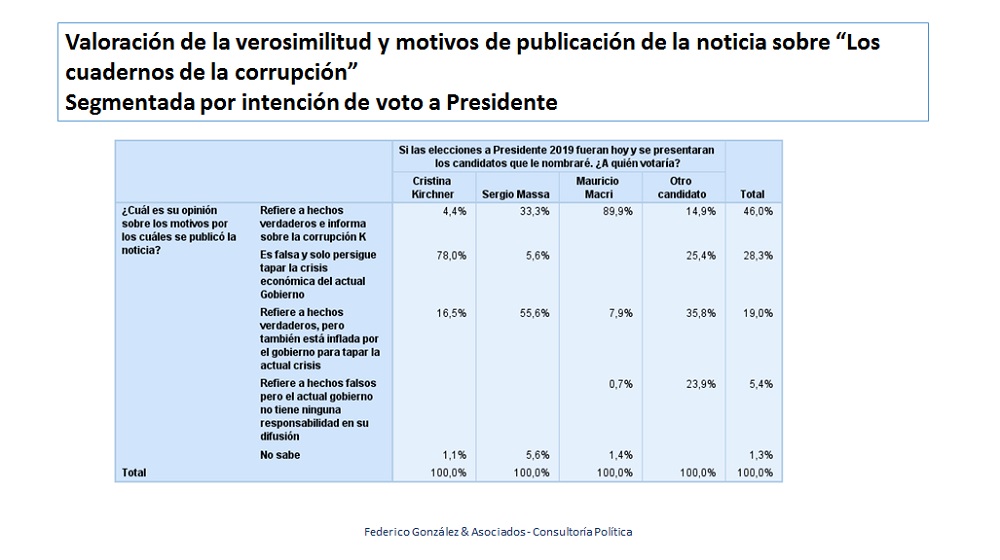 Un sondeo elaborado por la consultora Federico González y Asociados revela el impacto del escándalo mediático y judicial generado a partir de la difusión de cuadernos que narran el circuito de la corrupción durante la década kirchnerista, medido desde la mirada de los votantes de CFK, de Sergio Massa y, claro, del oficialismo.