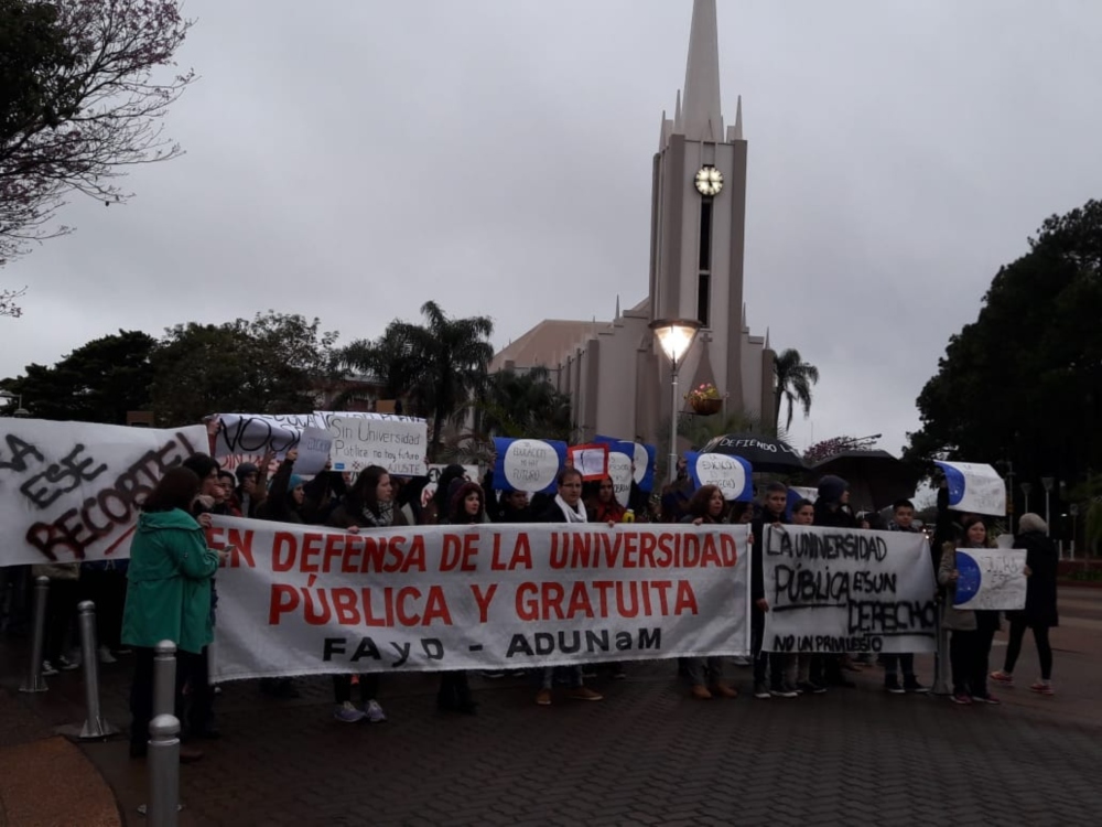 La medida comenzó cerca de las 11 y reunió a la comunidad educativa de dicha facultad que, con pancartas y cánticos, caminaron por las calles de Posadas para terminar en la Plaza 9 de Julio.