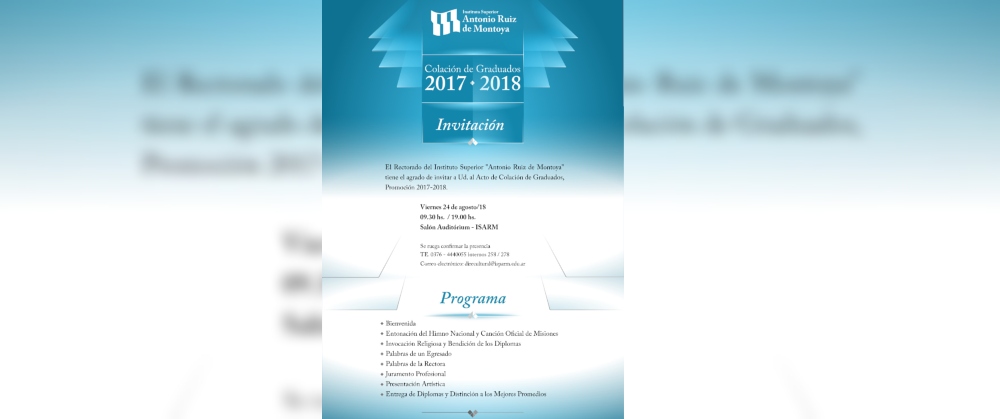 El Rectorado del Instituto Superior “Antonio Ruiz de Montoya” invita a los egresados y a la comunidad en general a los Actos de Colación de Graduados 2017-2018, a realizarse el viernes 24 de agosto del corriente año, en el Salón Auditórium de la Sede Central, en Ayacucho 1962 de la ciudad de Posadas.