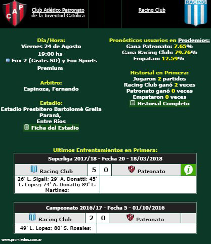 El encuentro se jugará a partir de las 19 en el estadio “Presbítero Bartolomé Grella”, será controlado por el árbitro Fernando Espinoza y televisado por FOX Sports. Patronato cayó en su visita a San Martín de San Juan por 1 a 0, necesita sumar de a tres debido a que está en zona de Descenso y el técnico Juan Pablo Pumpido tendrá una baja importante, ya que no tendrá disponible a Facundo Barceló.                El delantero sufrió un esguince de ligamento lateral grado 2 de su rodilla izquierda tras recibir un golpe en el partido ante el conjunto de San Juan, tendrá un período de rehabilitación de aproximadamente 45 días y para recibir a Racing será reemplazado por Ezequiel Rescaldani.                                                                                                      Por su parte, Racing venció a Vélez como local por 2 a 0 en la jornada anterior de la Superliga y el entrenador Eduardo Coudet decidió realizar seis variantes en relación a los once que salieron a disputar ese encuentro. Dos de ellas serán en el ataque, donde no estarán Lisandro López y Gustavo Bou.                      Además, el “Chacho” dispuso que Iván Pillud ingrese por Renzo Saravia mientras que Marcelo Díaz irá por Nery Domínguez, Augusto Solari por Matías Zaracho y Guillermo Fernández por Neri Cardozo.