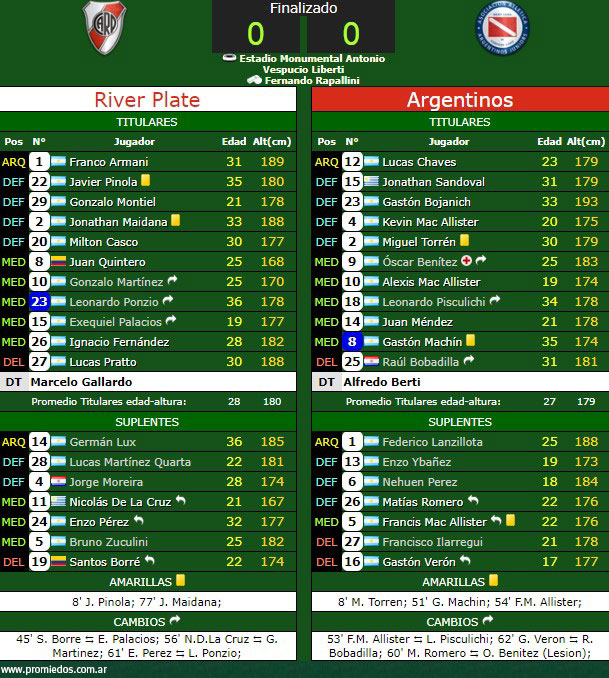 Con este resultado, River, que venía de empatar como local con Belgrano (0-0), tiene tres puntos, producto de las tres igualdades, mientras que Argentinos, que llegaba de un 0 a 0 como local con Godoy Cruz, suma dos puntos.