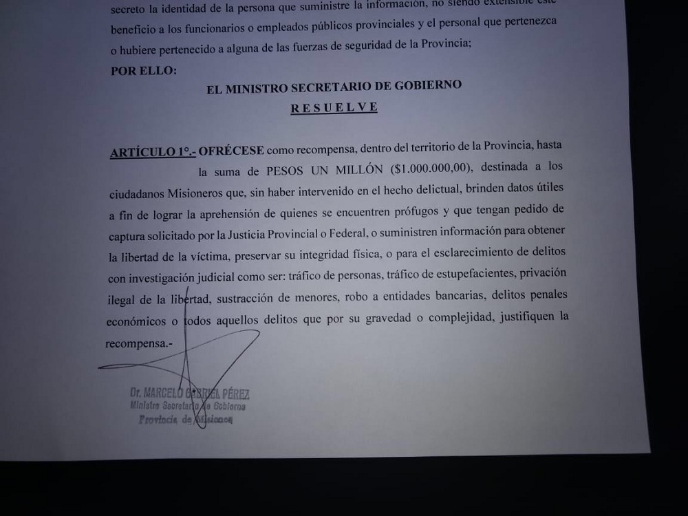 El proyecto (todavía no es resolución) fue firmado este jueves por el Ministro de Gobierno, Marcelo Gabriel Pérez, y establece que “a fin de facilitar la tarea (captura de prófugo) se hace necesario instrumentar un sistema de compensación por datos para la resolución de delitos con investigación judicial mediante el abono de una recompensa pecuniaria a aquellas personas que, sin haber intervenido en la comisión del delito, brinden datos útiles para el esclarecimiento del mismo”.