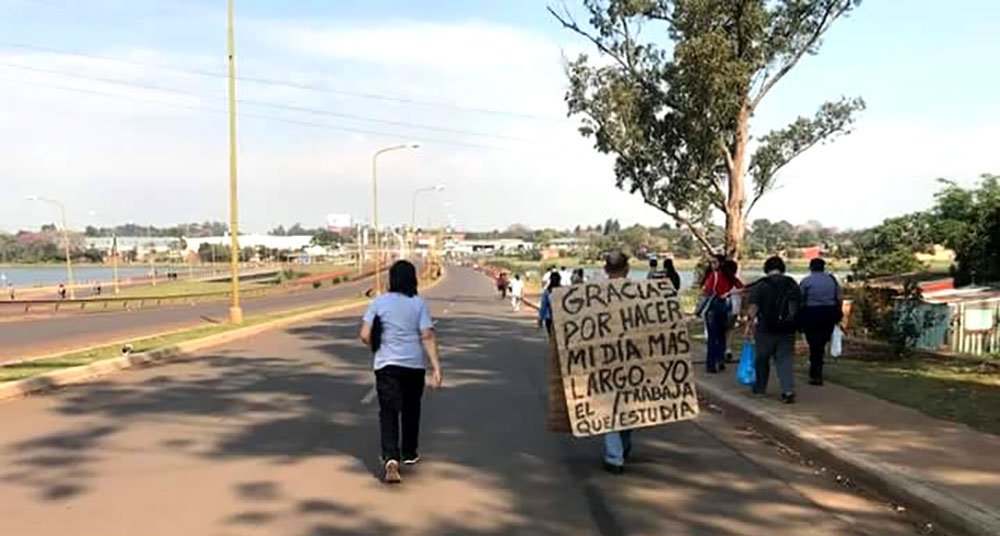 Una de las personas afectadas (y cansadas) por el corte de la ruta 12 y Cabo de Hornos decidió manifestar su malestar y, resignado, realizó el trayecto que debe encarar a pie bajo el fuerte sol misionero con este singular cartel.