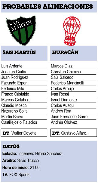 El segundo partido de la jornada se jugará a las 21 en el estadio Hilario Sánchez, donde San Martín de San Juan será local de Huracán con Silvio Trucco como juez principal y televisación en directo por la señal de cable Fox Sports.