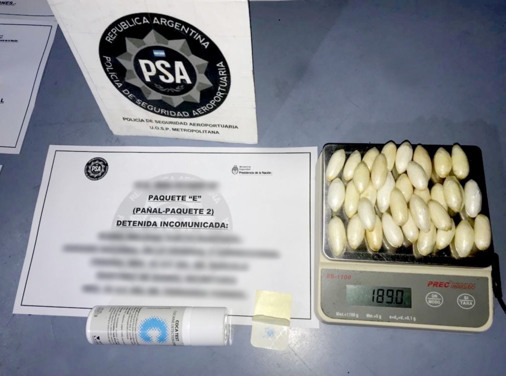 Luego se la trasladó a la sala de requisas para un control completo que arrojó como resultado el hallazgo de paquetes y cápsulas de sustancia blanquecina distribuidas en el interior de su sostén, en un pañal y un apósito. Las pruebas de campo correspondientes dieron positivo para clorhidrato de cocaína, y en total la PSA secuestró 963 gramos de dicha droga.