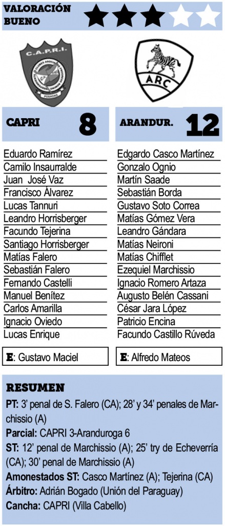 En los minutos finales, el “azurro” siguió buscando con la misma fórmula, pero Aranduroga aguantó bien y un nuevo penal de su apertura (a los 30) le dio un poco de aire ante la desesperación de CAPRI, que dejó pasar una gran oportunidad ante un rival directo.