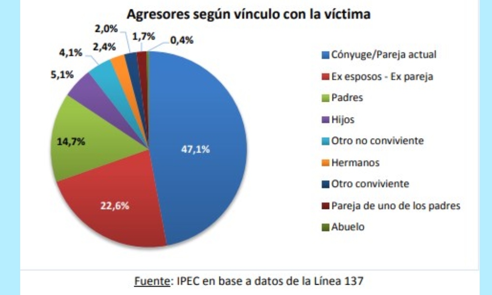 El género masculino es el más denunciado en las llamadas a la Línea. Sobre un total de 3.150 casos donde se registran datos, el 85,3% de los agresores son hombres; el 14,6% mujeres y el 0,1% (dos casos) son transgénero. En cuanto a los vínculos, en el 47.1% de los casos el vínculo entre el agresor y la víctima es el de “cónyuge o pareja actual” mientras que en el 22,1% de los casos son la expareja o excónyuge. En el 14,7% de los mismos son los padres de las víctimas quienes aparecen como agresores. Sobre un total de 2.065 casos denunciados, en el 95,8% de ellos existió un agresor, en el restante 4,2% de dos a seis. Del total de agresores denunciados (811) el 32,3% tienen entre 21 y 30 años; el 27,0% entre 31 y 40 años; y el 13,9% entre 41 y 50.