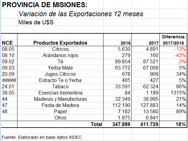 De acuerdo a los datos oficiales del INDEC en el año 2017, las producciones con más salida al exterior fueron Pasta de Madera por 127 millones de dólares; Té por 87 millones; Yerba Mate por 67 millones; Tabaco por 62 M; Maderas y Manufacturas por 38 M; Papel por 13 M; Cítricos por 4,8 M, Esencias trementina por 1,1 M; luego arándanos, jugos cítricos y extractos de té o yerba por menos de un millón cada una.