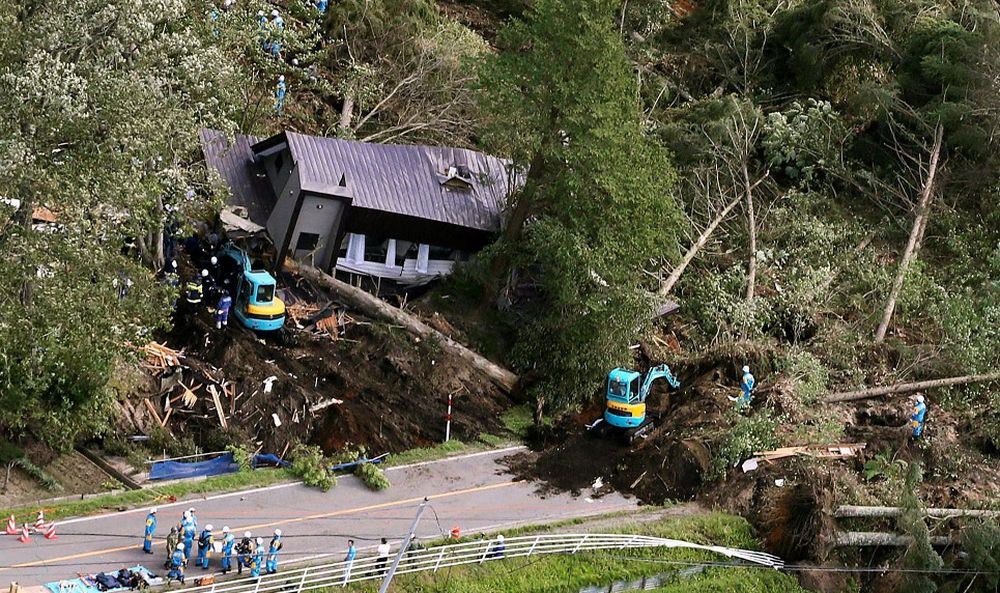 Unas fotografías aéreas muestran los estragos causados por un corrimiento de tierra que arrancó todos los árboles de una ladera y sepultó casas en la localidad de Atsuma, donde 39 personas estaban desaparecidas, según el canal público de televisión NHK.
