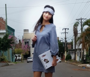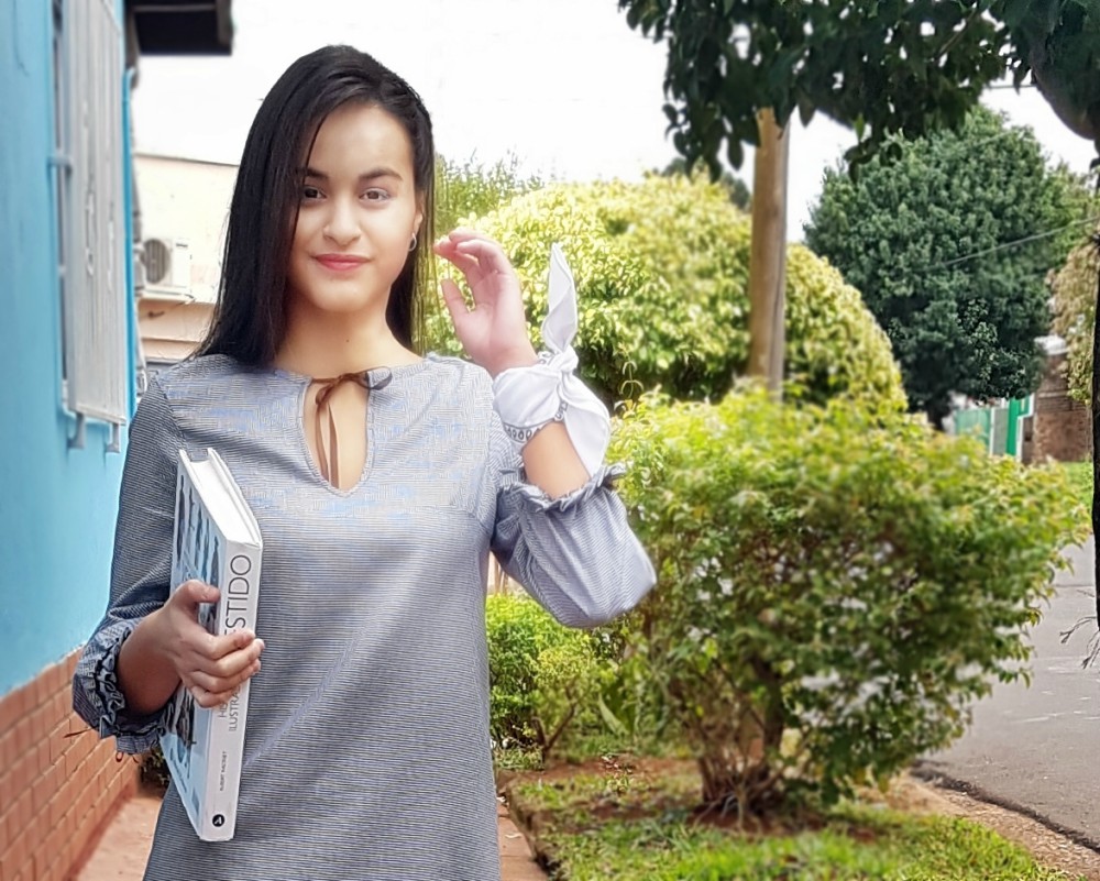 Nahir Britez, con 17 años de edad, actual directora del cuerpo de baile del colegio Roque González, eligió look canchero y distendido. Por un lado, la bandana en tono blanco como vincha, o también anudada en la muñeca, aporta estilo al vestido gris.