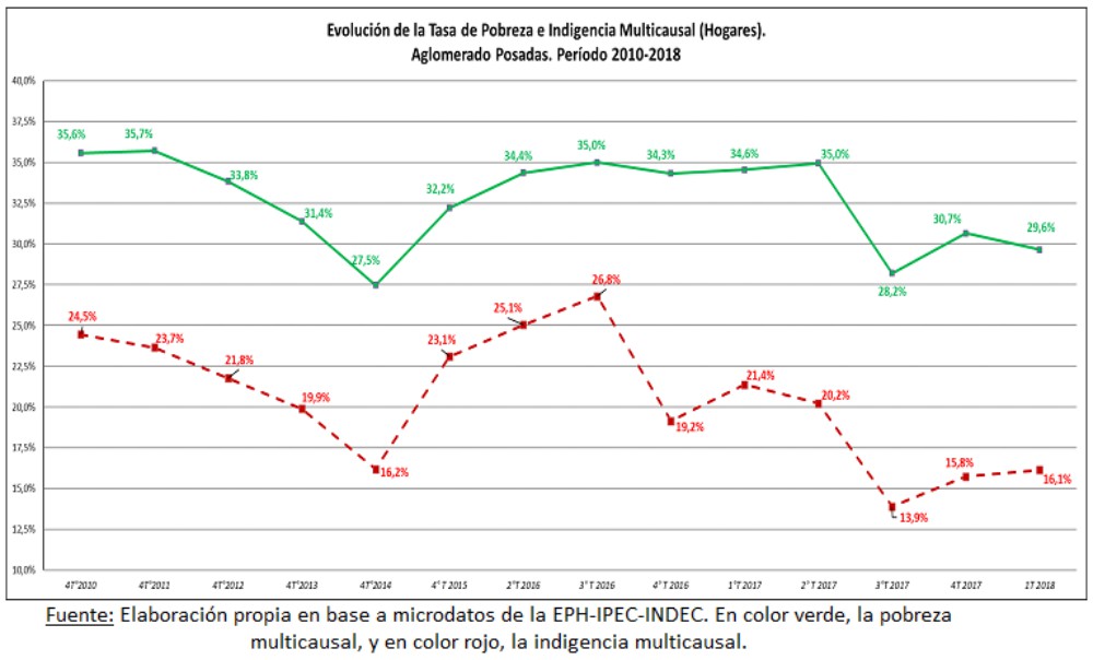 “El índice de Pobreza Multicausal o Multidimensional en Hogares en el primer trimestre de 2018 del Aglomerado Posadas, fue del 29,6%. El índice de Indigencia en Hogares fue del 16,1%”, remarcó el informe.