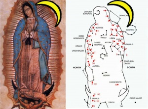 Pues si se presenta con un manto de estrellas mostrando ubicaciones de constelaciones es para que nosotros descifremos qué es lo que nos quiere decir, ya que como bella mujer que es, a ojos humanos habría preferido mostrarse con un manto ricamente recamado en piedras, que es la forma como la representamos, que si ha hecho ese milagro de estamparse a sí misma, bien podría haberse hermoseado según nuestros conceptos de lo que es bello.