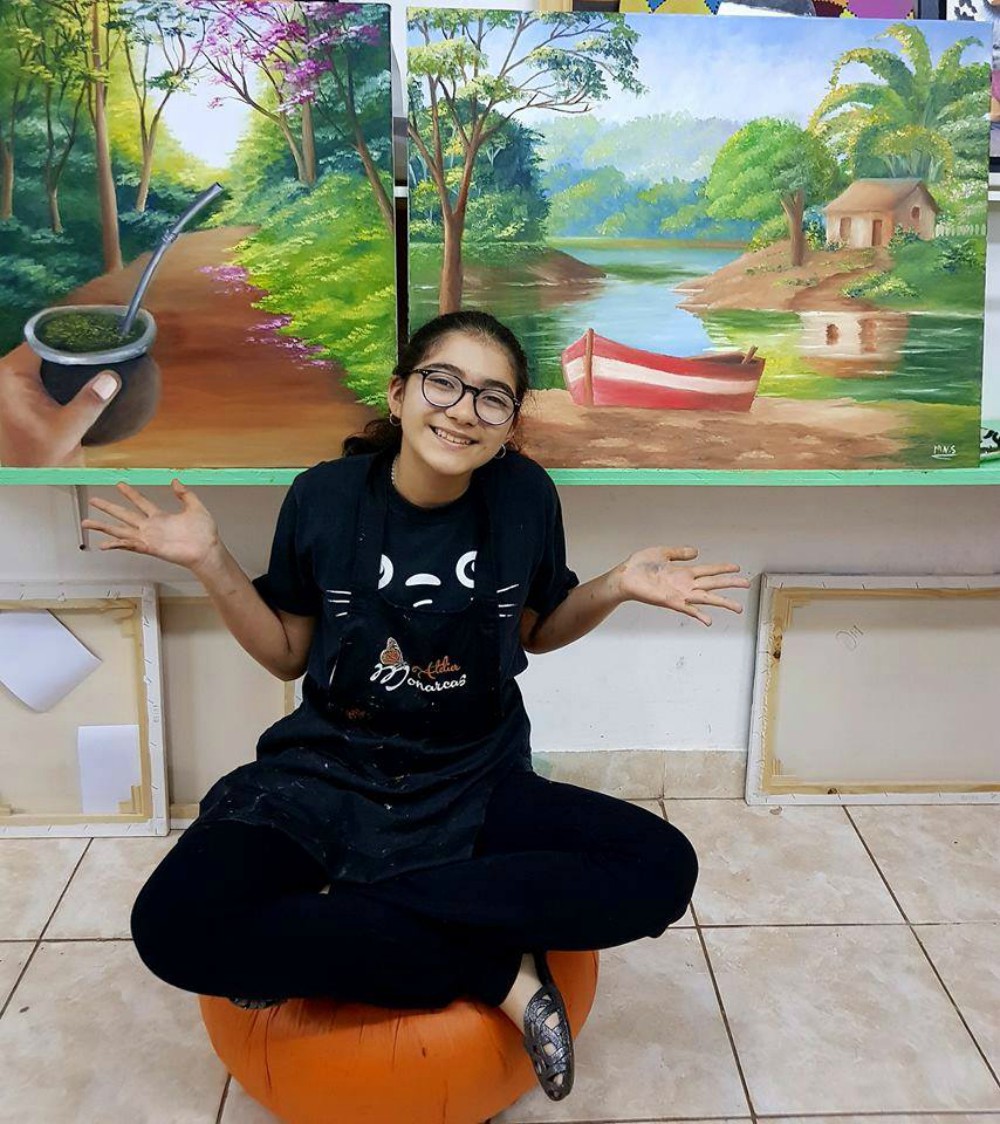 Vicky es muy talentosa, ella aprende muy rápido, maneja la teoría del color como ninguna, y cuando está terminando una obra ya va pensando en la siguiente. En una de sus obras tuvo una idea muy original, quería pintar algo bien misionero, así que tomo una foto de un paisaje con camino colorado, y usó de modelo la mano sosteniendo un mate de su papá. Y la tienen que ver dibujando, increíble, lo hace de manera muy espontánea y con mucha seguridad.