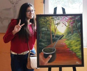 Vicky es muy talentosa, ella aprende muy rápido, maneja la teoría del color como ninguna, y cuando está terminando una obra ya va pensando en la siguiente. En una de sus obras tuvo una idea muy original, quería pintar algo bien misionero, así que tomo una foto de un paisaje con camino colorado, y usó de modelo la mano sosteniendo un mate de su papá. Y la tienen que ver dibujando, increíble, lo hace de manera muy espontánea y con mucha seguridad.