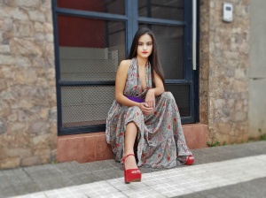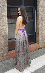 Su look fue optar por usar el cabello suelto y sandalias rojas en contraste con el diseño. Otras opciones para lookearse, podría ser un trenzado en el cabello y semirecogido y por qué no algún accesorio (cadenitas, perlas) que cuelguen en la espalda.