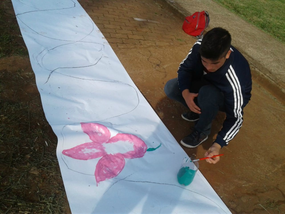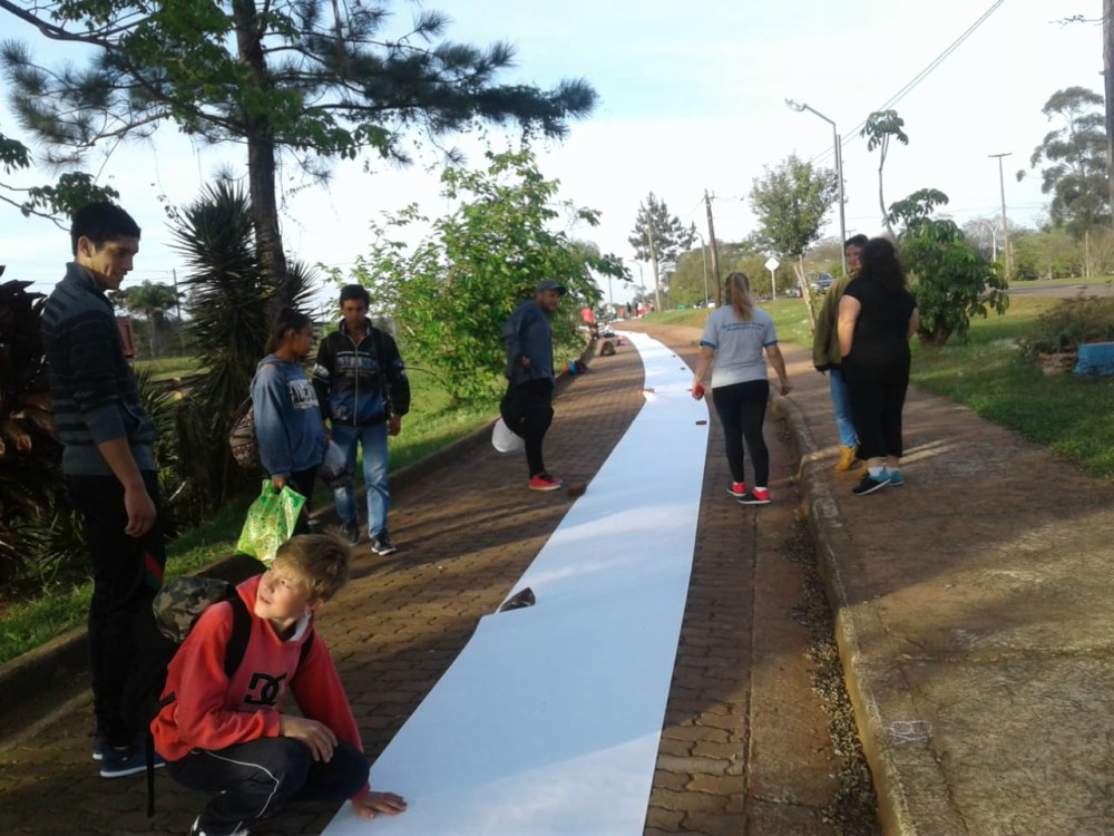 En esta semana del estudiante, y como parte de un proyecto que vienen desarrollando como parte de la currícula, alumnos de San Javier, Leandro N. Alem, Apóstoles y Arroyo del Medio, entre otras localidades que núclea a esta Secundaria, comenzaron su tarea de pintar el dibujo más largo, a las 8 de hoy.