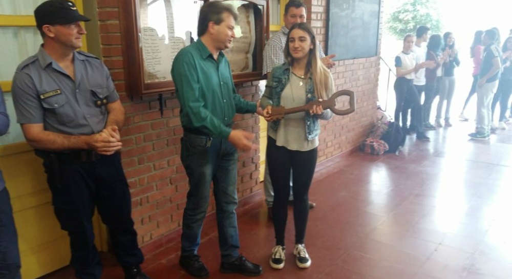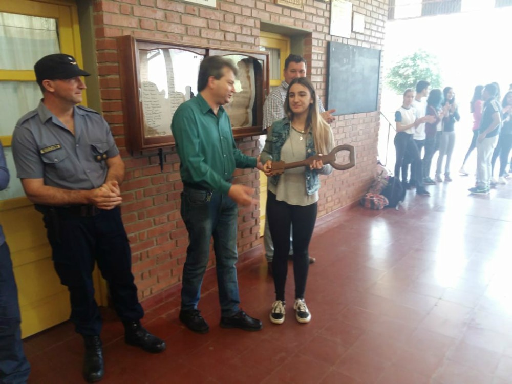 En el acto de entrega de llaves realizado en el BOP N°4, Dudek puso en funciones como intendente a la presidente del Centro de Estudiantes, Belén Ferrarotti; como presidente del Concejo Deliberante a la vicepresidente de ese centro, Soledad Fleitas; como Secretario de Gobierno a la Secretaria del Centro a Blanca Cano y tesorero a la tesorera del Centro de Estudiantes a Josefina López.