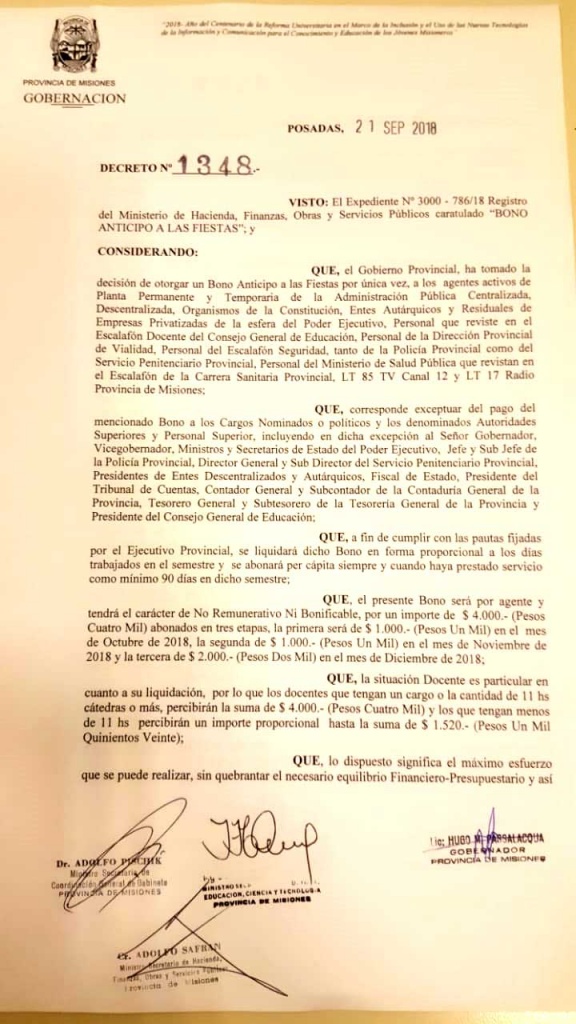 Misiones es la primera provincia en tomar la decisión de abonar un adicional de carácter único y extraordinario en estos momentos en que las familias deben ajustarse para enfrentar los efectos de las medidas económicas que alcanzan a todo el país.