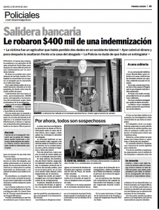 Lo cierto es que la víctima, su mujer y el abogado ingresaron a un sector reservado del banco, en el que cobraron el dinero. Allí mismo dividieron las partes.