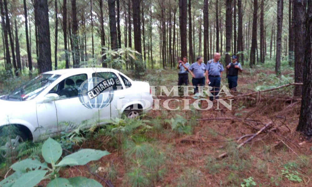 ABANDONADO. Así fue encontrado días después el Chevrolet Corsa blanco de la pareja que los ladrones se llevaron de la chacra de Paraje Santa Irene (Archivo).