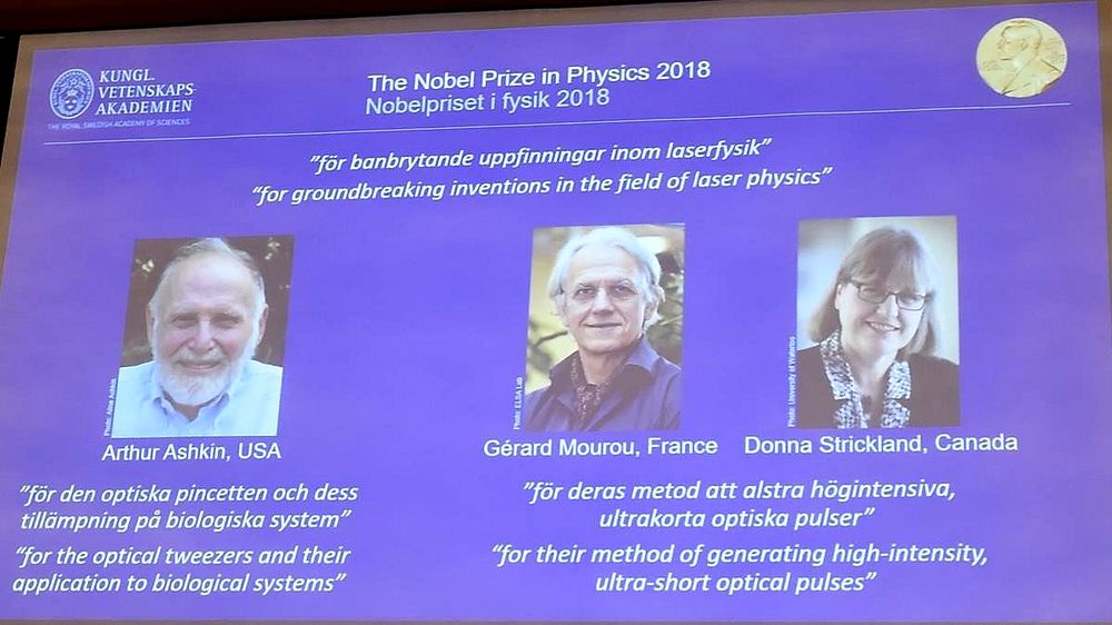 BREAKING NEWS⁰The Royal Swedish Academy of Sciences has decided to award the #NobelPrize in Physics 2018 “for groundbreaking inventions in the field of laser physics” with one half to Arthur Ashkin and the other half jointly to Gérard Mourou and Donna Strickland. pic.twitter.com/PK08SnUslK