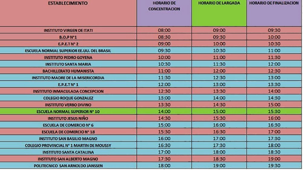 Luego será el turno del Instituto Madre de la Misericordia, la EPET 1, el Instituto Inmaculada Concepción. Después pasarán el Colegio Roque González, el Instituto Verbo Divino; la Escuela Normal Superior 10, el Instituto Jesús Niño, la Escuela de Comercio 6 y la Escuela de Comercio 18.
