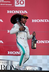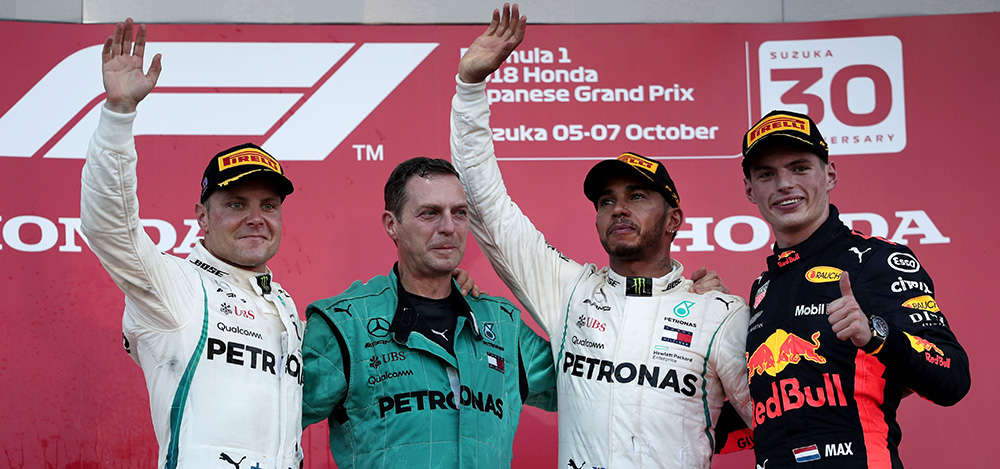 Los corredores que seguían a Hamilton en la parrilla de salida, el finlandés Valtteri Bottas (Mercedes) y el holandés Max Verstappen (Red Bull), pese a una penalidad de cinco segundos por tocar al finlandés Kimi Räikkönen (Ferrari), completan el podio en Suzuka.