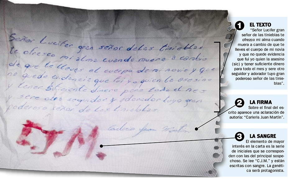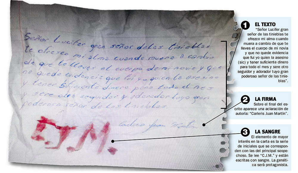 La carta, que en exclusiva PRIMERA EDICIÓN presenta hoy por primera vez, fue firmada con sangre y será la genética la encargada ahora de confirmar las sospechas que tiene la Justicia sobre Carleris. También los peritos caligráficos, que cotejarán la escritura que presenta la misma con la del detenido.