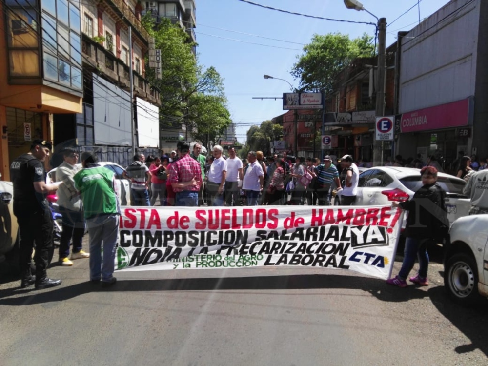 Un centenar de trabajadores realiza una protesta frente a las oficinas del Ministerio del Agro de la Provincia, cortando la esquina de las calles Colón y Sarmiento, en pleno microcentro de Posadas.