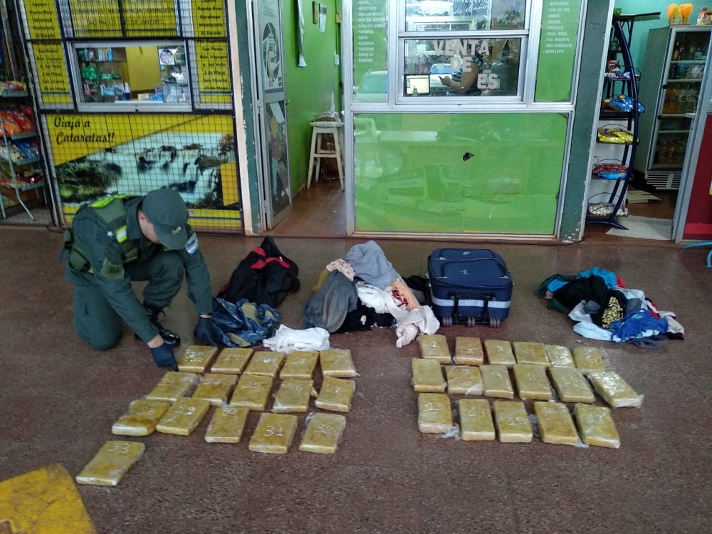 Los efectivos pidieron apoyo del binomio cinotécnico y personal de Criminalística y Estudios Forenses del Escuadrón 11 “San Ignacio” para revisar el contenido de: una valija y un bolso de mano. En presencia de testigos el can detector de drogas reaccionó ante la presencia de estupefacientes al pasar por los equipajes en cuestión. Precedieron a la apertura los objetos, los cuales contenían, entre ropas viejas, panes rectangulares, con cinta de embalar color ocre y film transparente. Sometidos a la prueba de campo narco test arrojó positivo para marihuana, el cual arrojó un peso total de 27,725 kgs del estupefaciente.