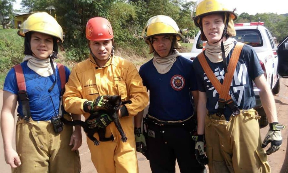 Luego de asegurar la seguridad en el área, con un corte en el suministro de energía, integrantes del equipo de Bomberos Voluntarios de El Soberbio procedieron al rescate de un gato atrapado en lo más alto del poste del tendido eléctrico.