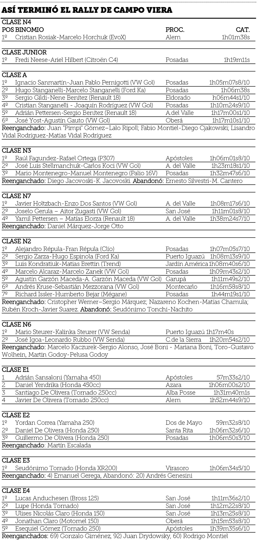 En el Grupo A, Ignacio Sanmartín-Juan Pablo Pernigoti terminó con el triunfo y lo propio hizo el apostoleño Raúl Fagúndez-Rafa Ortega con su Peugeot 307 en la N3. El ritmo y la regularidad en cada tramo fue la clave para las victorias correspondientes, que los dejó como los mejores de la clasificación general.