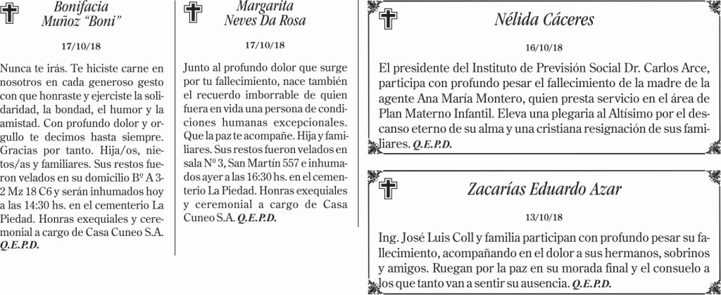 Fúnebres del jueves 18 de octubre de 2018